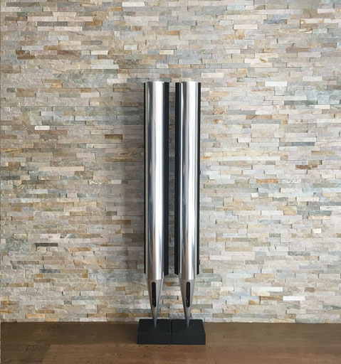 A tall column speaker shaped like a church organ and sitting upon a very small footprint, the curved minimalist design of BeoLab 8000 eliminated sharp edges or joints which could compromise sound quality. The speakers were magnetically shielded in order to be situated in close proximity to a television monitor.